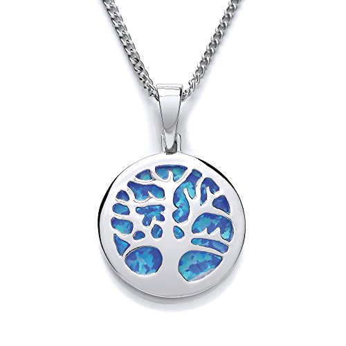 A stylish tree of life pendant, made from silver which has been rhodium plated and styled with a blue synthetic opal backing to highlight the 'Tree of Life' emblem, complete with a 46cm curb chain.